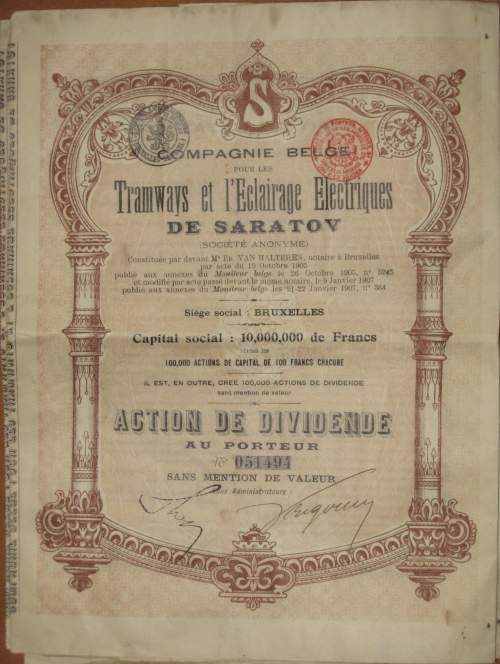 4,5-процентный заем Акционерного общества Трамваи и электрическое освещение г.Саратова, 1907 года. УК - 10 000 000 бельгийских франков. Выпущено 12 000 облигаций.