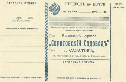 Бланк почтового превода на подписку журнала "Саратовский садовод".
