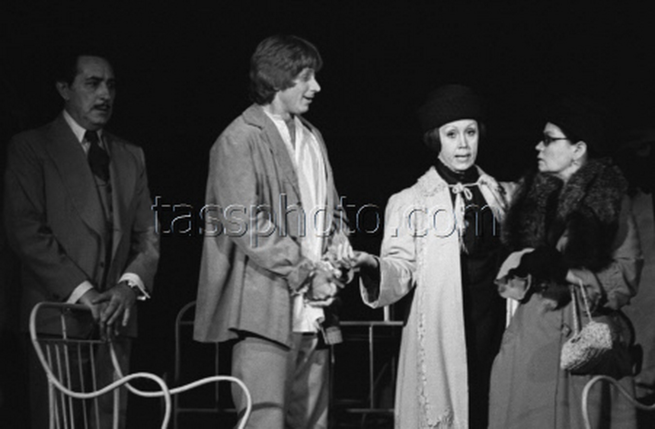 Слева направо: Жорж - заслуженный артист РСФСР М. Иванов, Мишель - Н. Маковский, Лео - заслуженная артистка РСФСР Л. Гришина, Ивонна - народная артистка РСФСР В. Ермакова.