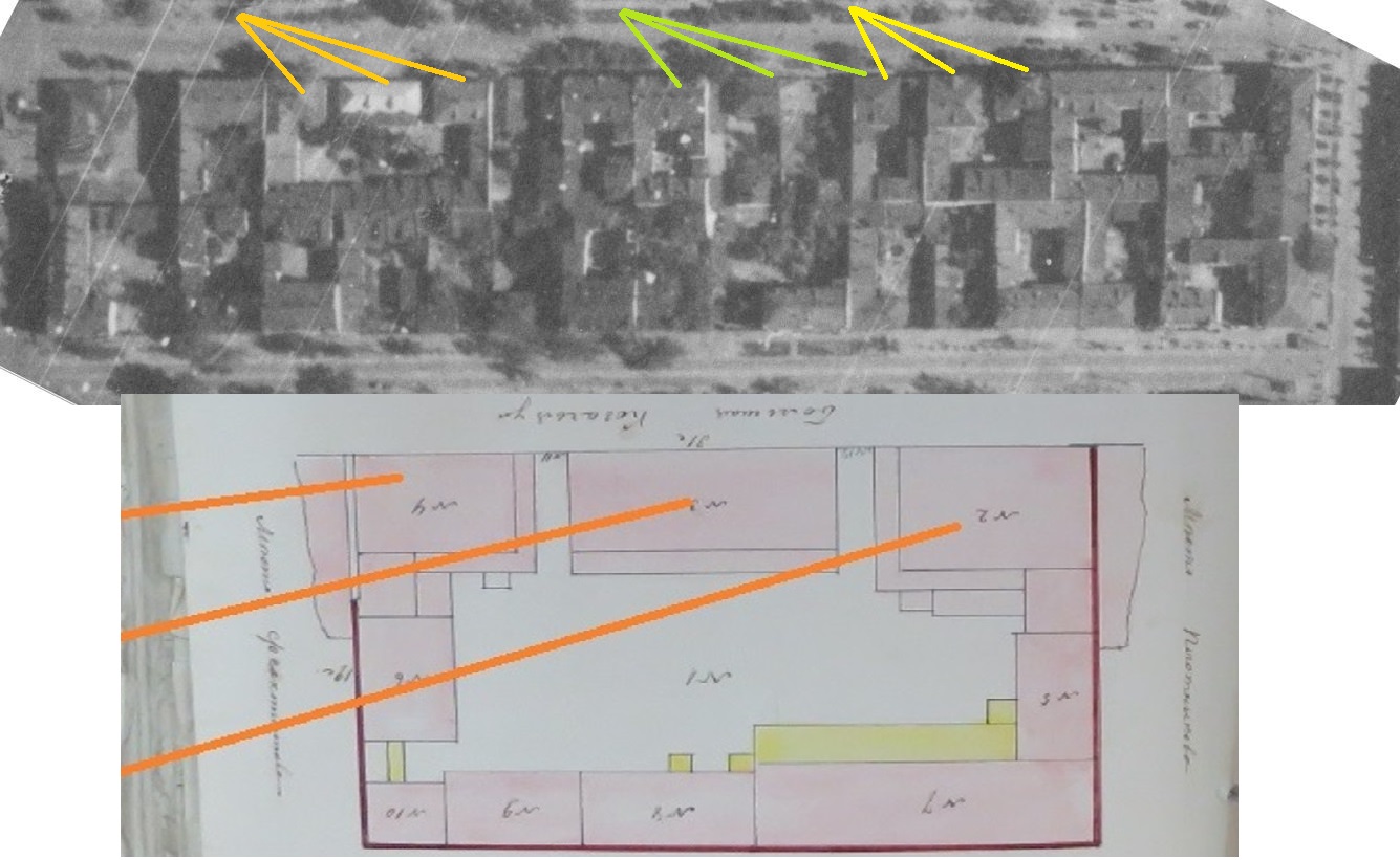 Если ориентироваться не только на 3 дома, выходящие на улицу, а на весь комплекс зданий домовладения, то вполне очевидно, что подходит только "оранжевый" вариант. Да и по этим 3 домам тоже - на "зеленом" в центре не один большой дом, а 2, разделенных брандмауэром (и домовладение там не одно, насколько я понимаю, как и в "желтом" варианте). Что касается схемы квартала - видимо, просто обозначено, что домовладение не на углу находится. Или банальная ошибка.