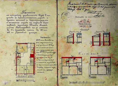 Проект на постройку деревянных двух 2 эт. домов с брандмауэрами служб и одноэт. флигеля с брандмауэрами и каменных служб на подвале саратовской купчихи Евгении Михайловне Матёровой на ее месте в 1-й г. Саратова части, в 181 пл. кв. по Грошовой улице. 1904 г.