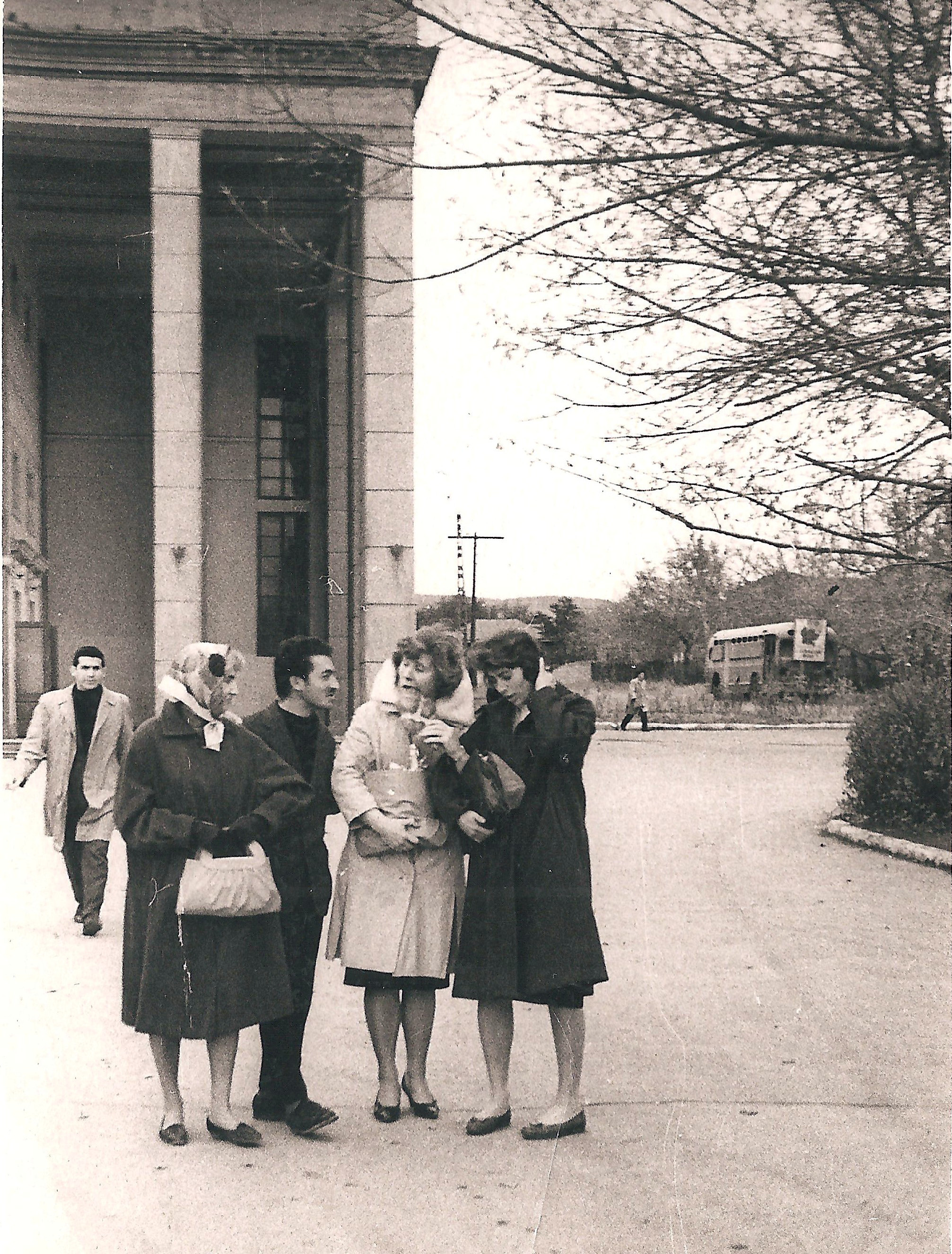 Слева скорее всего виднеется автобус с фотографии http://oldsaratov.ru/photo/ulica-kraynyaya-stroitelstvo-obshchezhitiya-spi