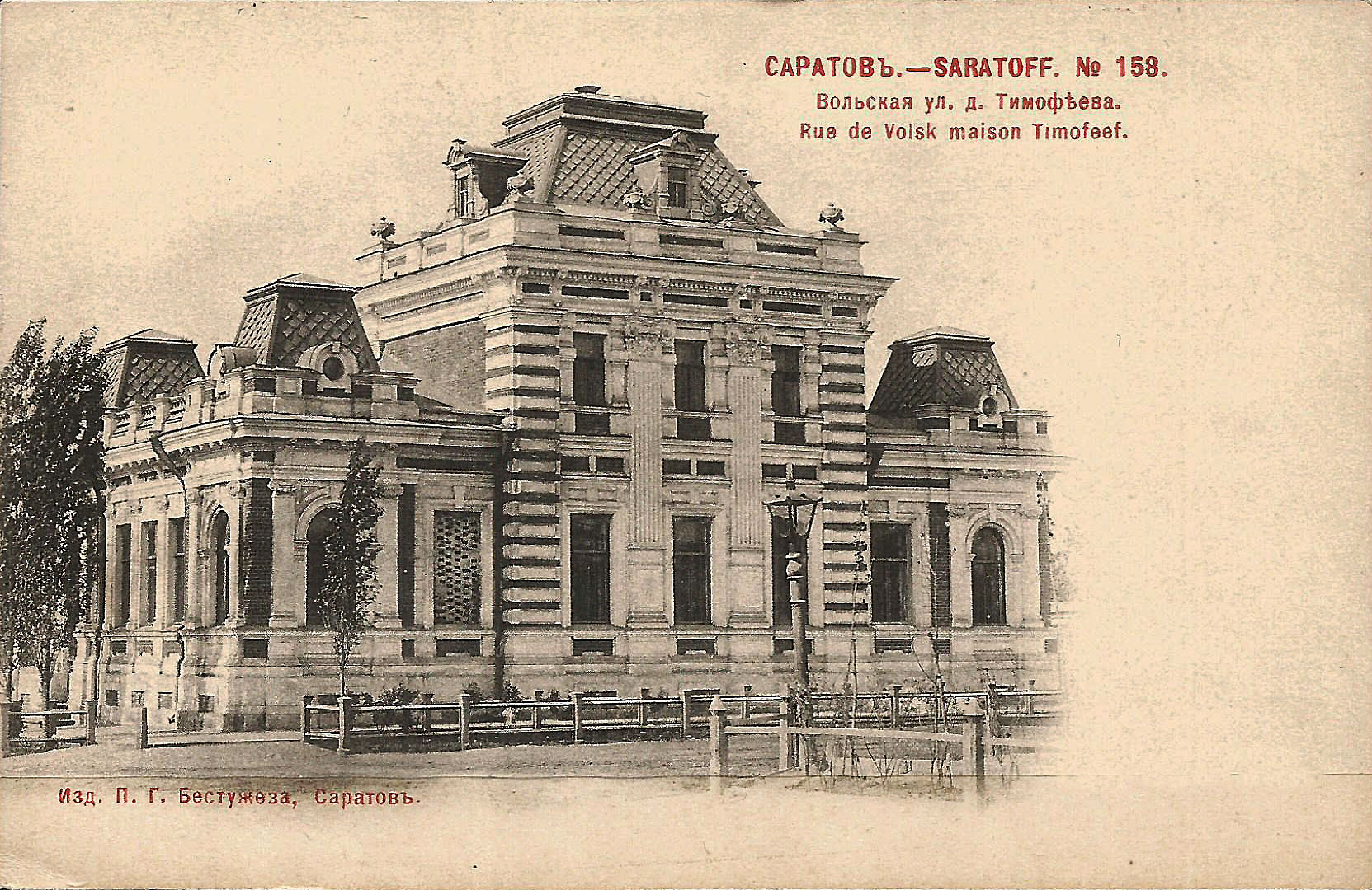 В книге "Старый Саратов в забавных картинках" В.Н.Семёнов пишет про дом Тимофеева "Построен он был в 1903 году, и первое время жил в нём вице-губернатор,тем более, что приехавший в тот же год новый губернатор П.А.Столыпин поселился в доме почти напротив."