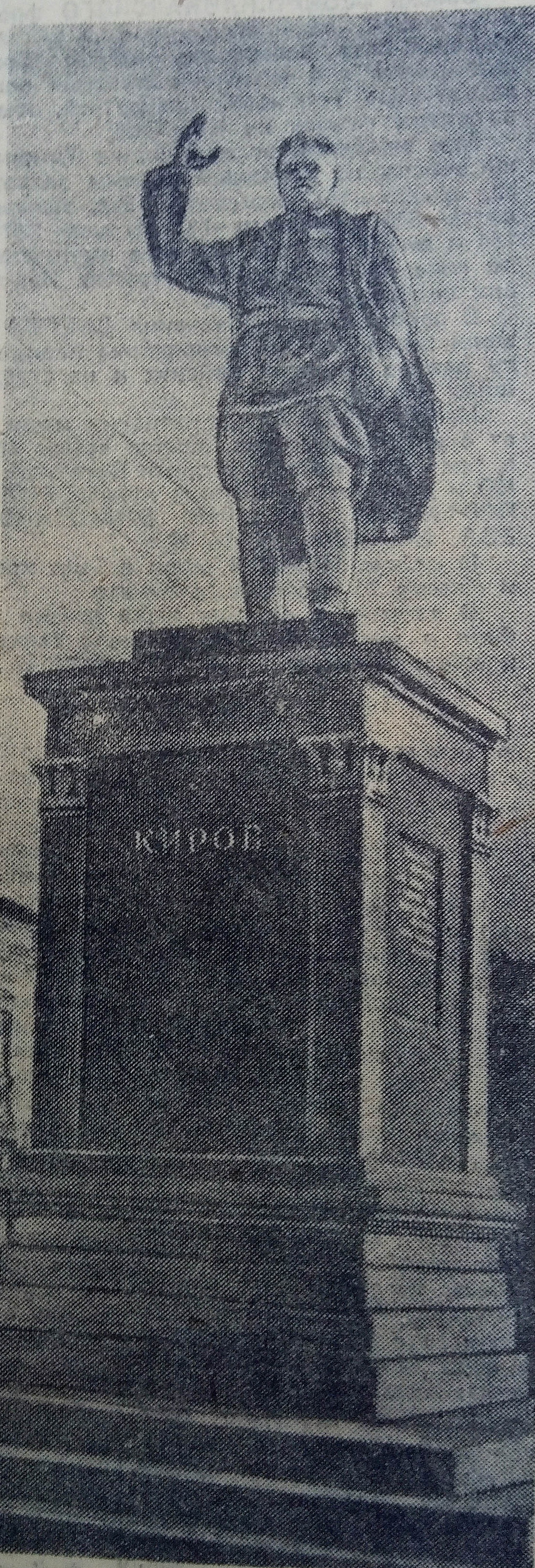 На БСЭ такая версия: "Трёхметровая железобетонная скульптура была выполнена по эскизам заслуженного скульптора З. М. Виленского(оригинал установили в Боровичах в 1936 году, наиболее известная из сохранившихся копий с 1939 года стоит в Ростове-на-Дону – ныне достопримечательность федерального значения). Изначально изготовленный на народные средства типовой памятник был предназначен для одного из западных городов. Однако, после заминки с доставлявшим его товарным поездом был выкуплен рабочими Кировского района и установлен на пьедестал, выполненный по проекту архитектора С. Гольдмана."