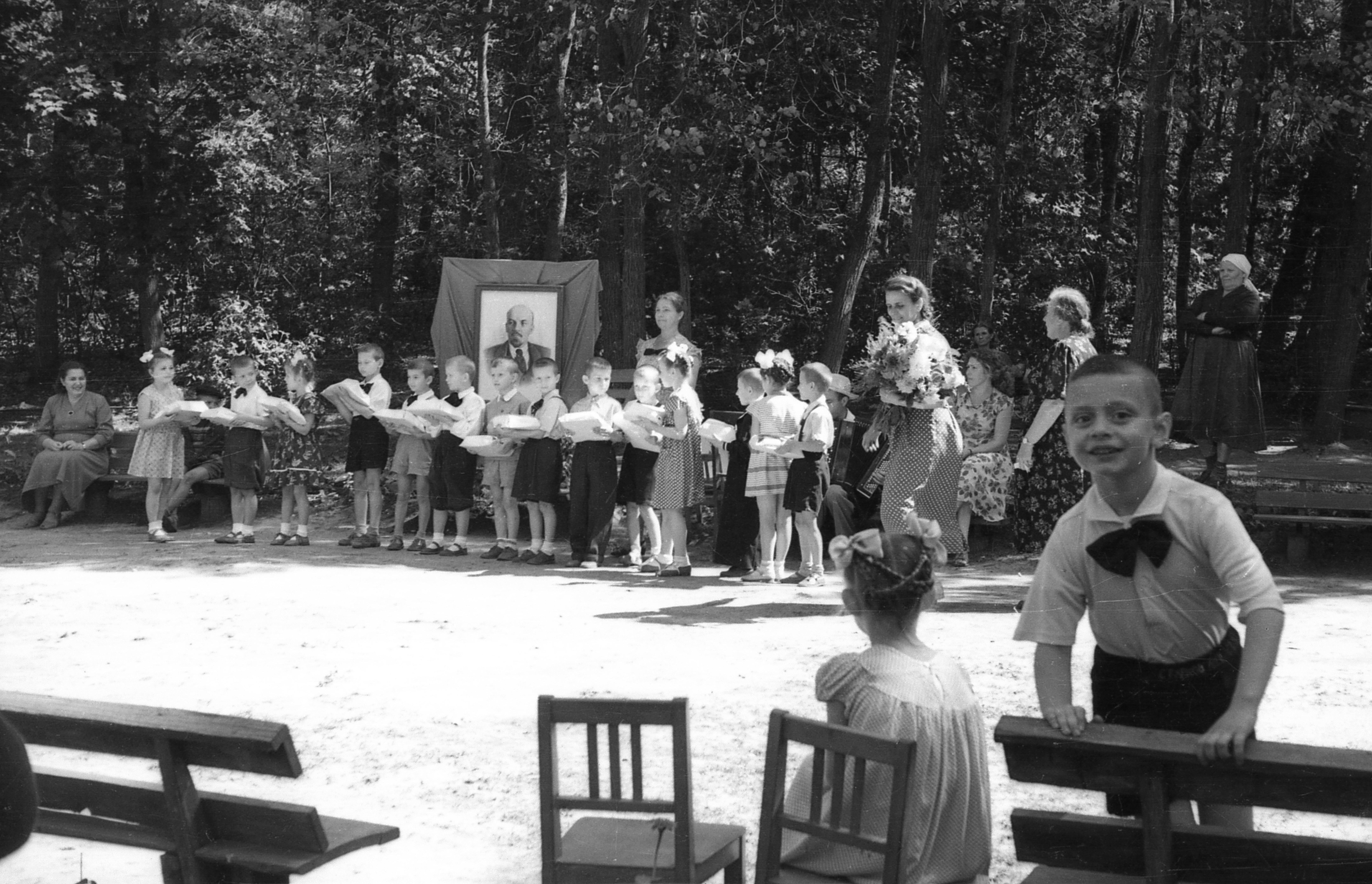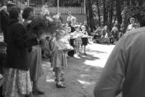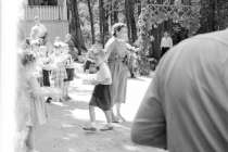 Детский сад №24. Летняя площадка на 9-й Дачной у Андреевских прудов, куда детский сад переезжал на все лето. Конец августа 1959 года. Торжественный выпускной для детей поступающих в первый класс школы. В дополнительных выложил все снимки, которые были на пленке. Я только на основной фотографии на переднем плане справа, мой старший брат в шеренге выпускников. Насколько я помню, фотографии никогда не печатались. Снимал мой отец, Старков Михаил Васильевич, на фотоаппарат "Зоркий" (Leica).