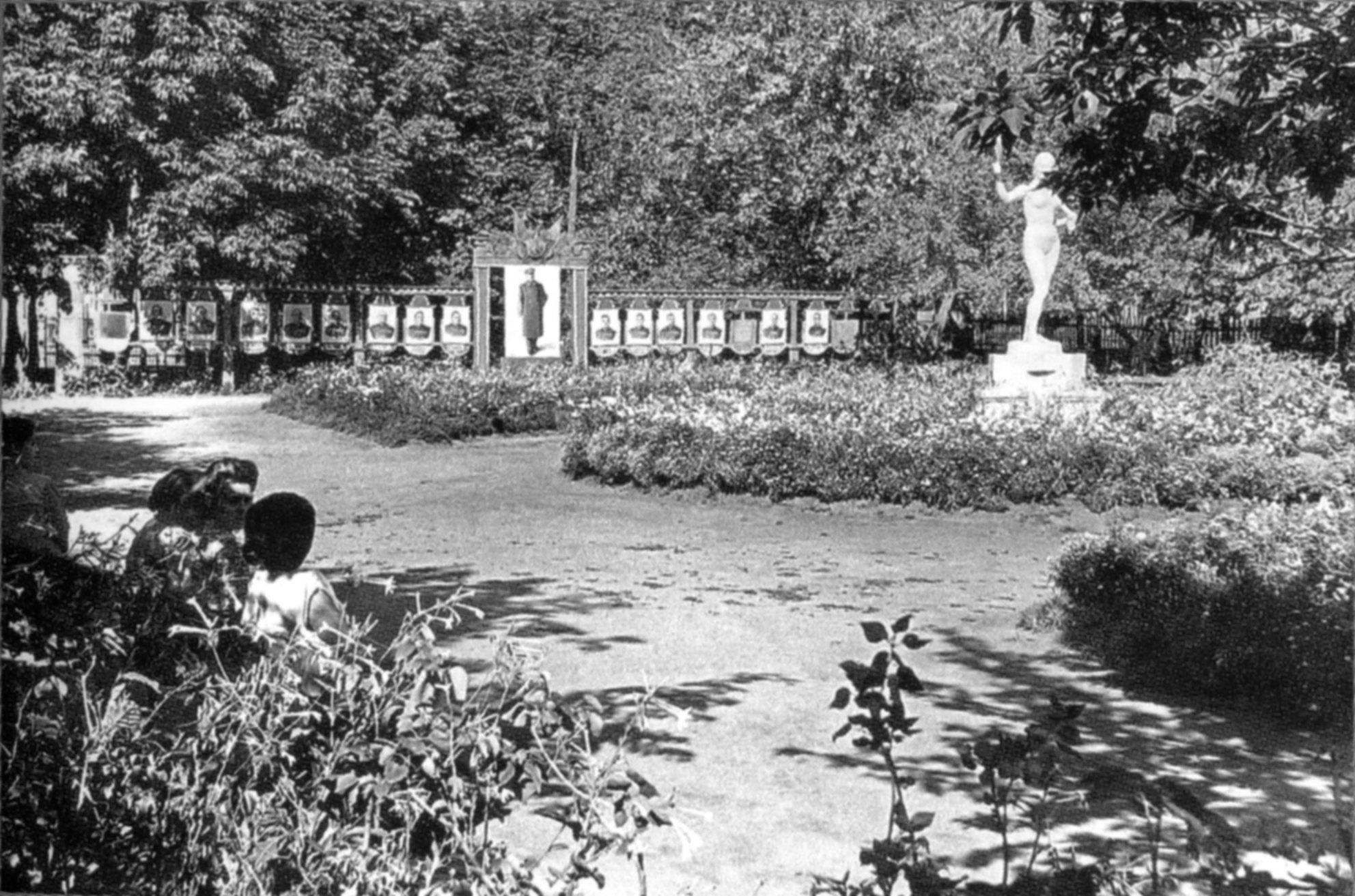 Судя по датированной фотографии с другой скульптурой на этом месте в 1951 году, это не члены президиума ЦК, а военачальники и др. руководители СССР военного времени (годовщина Победы). Поменял дату и заголовок.