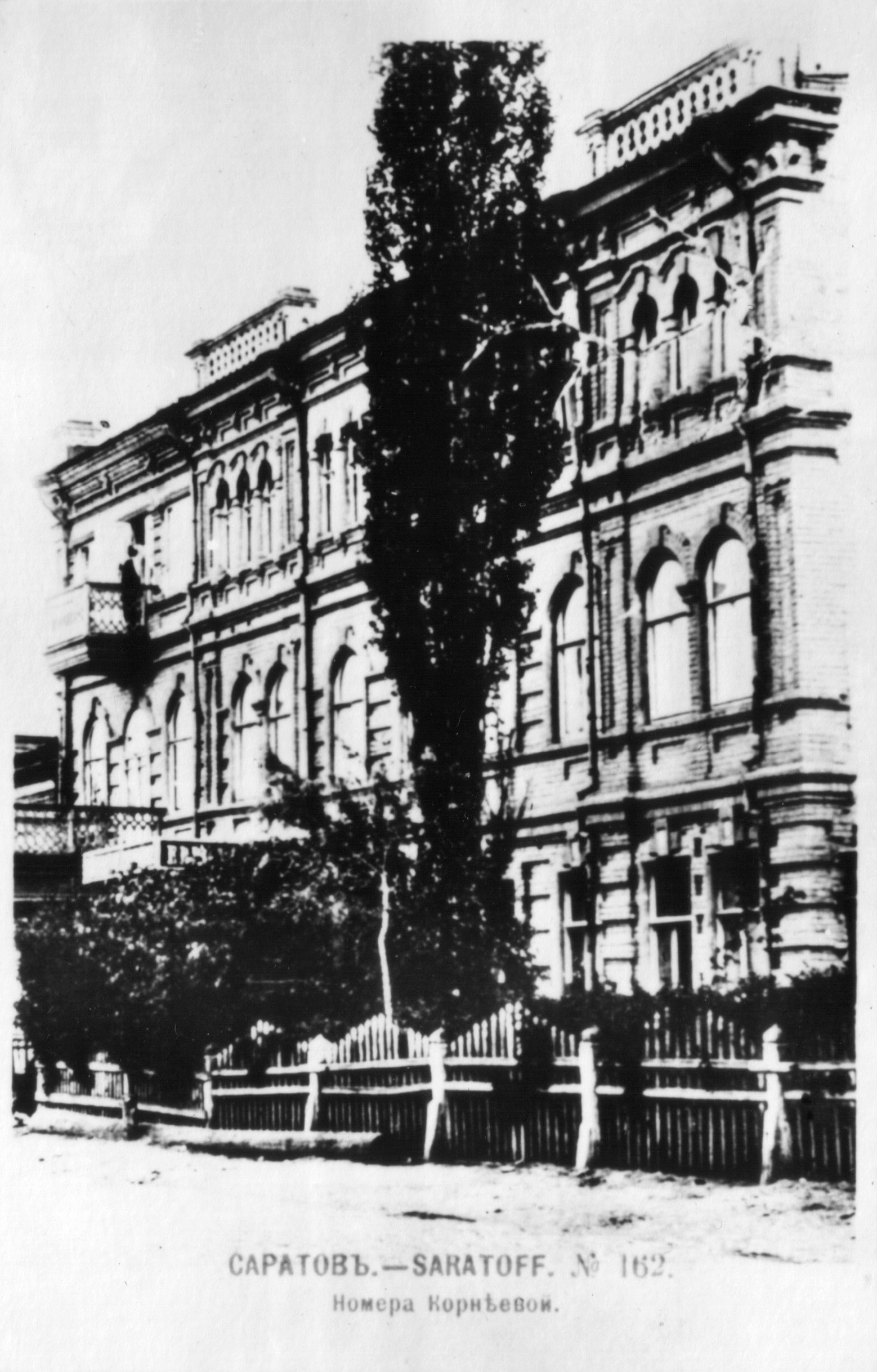 В 1865 году на улице Немецкой, во втором её квартале появился новый домовладелец Максим Михайлович Корнеев. Был Максим Михайлович обувных дел мастер и имел в доме обширный и хороший магазин. Но в историю Саратова дом вошел как здание с «номерами Корнеевой». Домовладение это, как и многие соседние, выходило на две параллельных улицы – Немецкую (пр. Кирова) и Малую Казачью (Яблочкова). Половину первого этажа под небольшой ресторан сначала снимал некто Свечин. Успех ресторанного дела позволил Свечину снять и второй этаж под шикарный ресторан. Соблазнённый успехом квартиранта, Корнеев забросил сапожное дело и открыл в доме гостиницу с номерами, а в дальнейшем устроил там даже ресторан с зимним тропическим садом. Деятельность Корнеева была то провальной, то успешной, а в 1877 году появились объявления о продаже из-за долгов дома на Немецкой и переносе «своей деятельности из помещения тропического зимнего сада на берег Волги».
