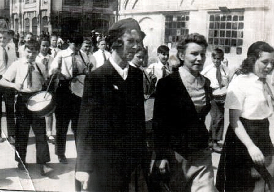 На заднем плане здание похоже на кинотеатр Ударник со стороны Первомайской (http://oldsaratov.ru/photo/kinoteatr-udarnik-na-ulice-gorkogo). Тогда здание по центру может быть гаражем (http://oldsaratov.ru/photo/na-ploshchadi-revolyucii-vozle-gosudarstvenno...) и колонна идет прямо на площадь.