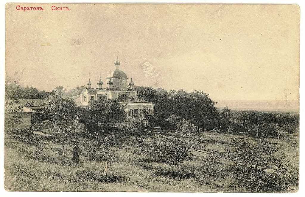 В 1848 г. епископ Саратовский и Царицынский Афанасий (Дроздов) приобрел у госпожи Таманской участок земли с садом и рощей для архиерейской дачи в четырех верстах от города, позади Спасо-Преображенского мужского монастыря. Со временем на этом месте возник мужской скит, и оно стало назваться Верхней Монастыркой. С 1882 по 1889 год при епископе Павле (Вильчинском) был сооружен храм во имя свт. Алексия Митрополита Московского. В скиту был пруд и фонтан. На территории скита располагалась археологическая ценность — "Вишневое городище" (стоянка древнего человека). В 1918 году Алексиевский скит был отчужден у Русской Православной церкви и с того времени сменил много хозяев. Храм потерял свой первозданный вид. Было снесено пять куполов и звонница. Судьба насельников скита доподлинно неизвестна, по воспоминаниям людей они были подвергнуты гонениям, а некоторые замучены в подвале храма. Сад был заброшен и большей частью вырублен, не стало водовода и фонтана, остался лишь сам родник. В 1929 году здесь разместили детский туберкулезный санаторий. В 40-е годы скитская земля стала застраиваться частными домами. В 1969 году в скиту расположилась гинекологическая больница. В 1982 году весь земельный участок был отведен отделу здравоохранения Саратовского горсовета. В 1986 году часть скитской земли была передана НПО "Алмаз" для строительства горно-лыжной базы. Здесь же планировалось в 13-й пятилетке построить инженерно-лабораторный корпус для НПО "Медтехника". В 1991 году территория скита была возвращена Русской Православной церкви. Ныне здесь располагается Свято-Алексеевский женский монастырь (http://www.svyatalm.ru/history.html). В дополнительных - рисунок Б.М. Мозера и открытка из коллекции Евгения Ашанина.