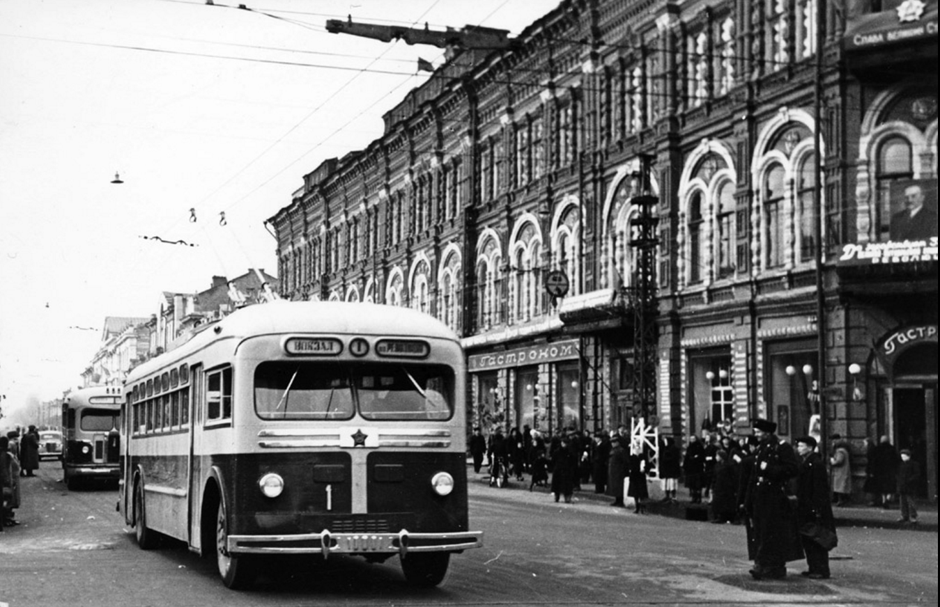 Троллейбус №1, 1952-й год. По Московской (проспекту Ленина) пересекает Горького в сторону Волги. Тогда это была конечная. В дополнительных кадр кинохроники (https://www.youtube.com/watch?v=POemNrDvGRo&t=342s)