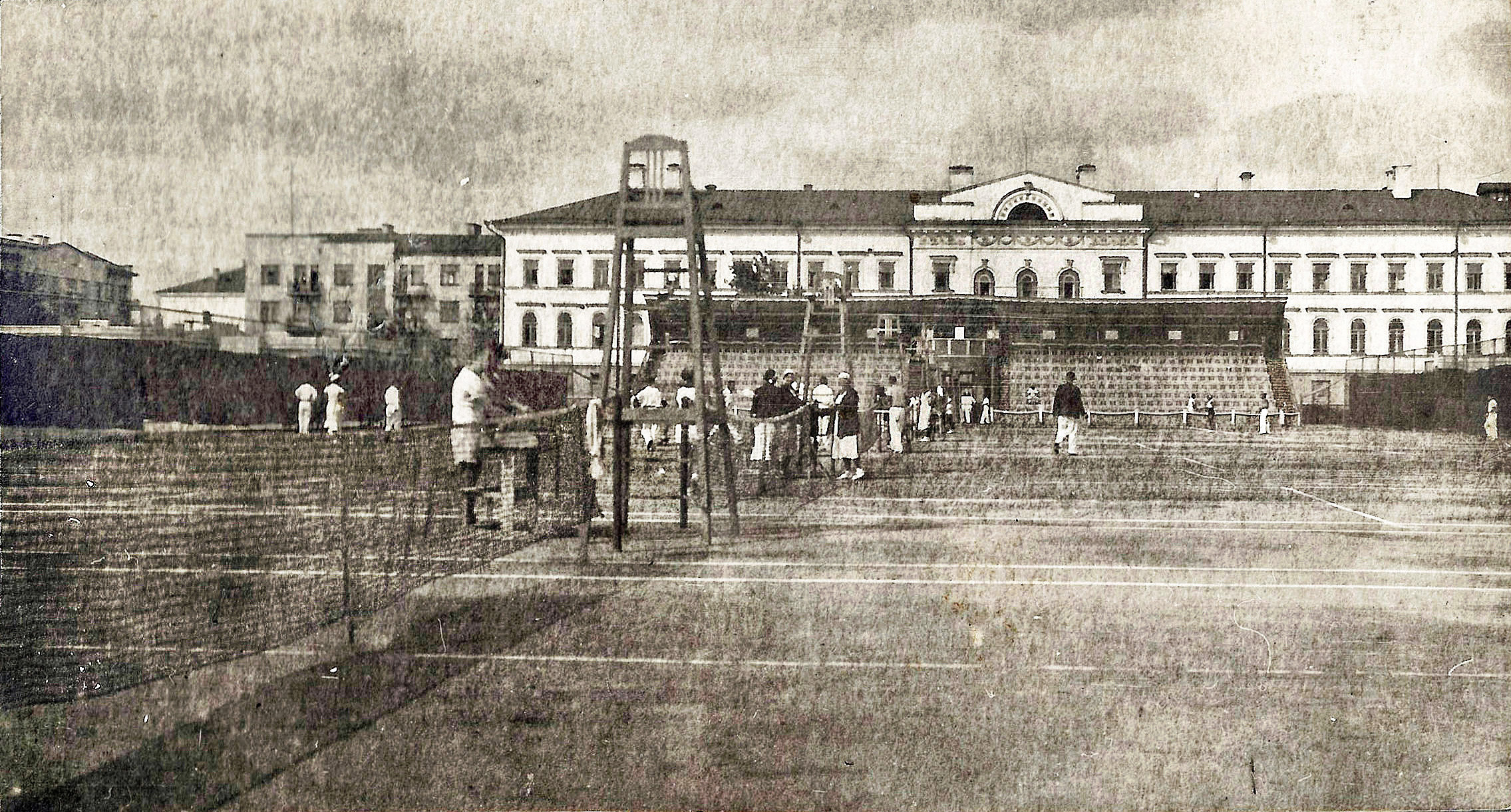 Теннисный стадион. Первенство СССР по теннису по второй категории в Саратове, 1–7 сентября 1937 года. Фото из архива Владимира Евгеньевича Голубинова. На первой фотографии в центре – бывшее здание губернских присутственных мест, ул. Радищева, д. 24. Слева в углу конструктивистские дома по ул. Радищева № 23 и 25 (см. фрагмент). На второй фотографии справа консерватория. На переднем плане слева – в белом и ракеткой в руках – Владимир Евгеньевич Голубинов (1912–1968). В.Е. Голубинов – архитектор, контруктор, член Союза архитекторов СССР, доцент и зав. кафедрой архитектуры Саратовского политехнического института (1962-1968). http://vm.sstu.ru/ekspozitsiya/golubinov-vladimir-evgenevich.html