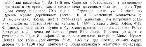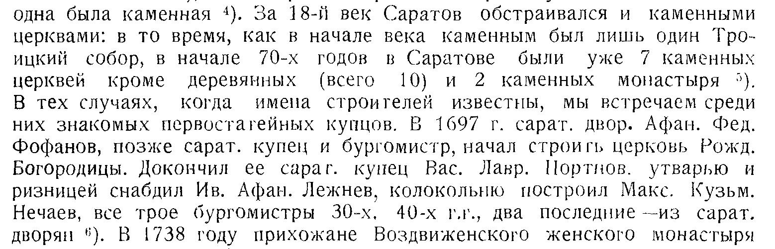 "В 1697 г. сарат. двор. Афан. Фед. Фофанов, позже сарат. купец и бургомистр, начал строить церковь Рожд. Богородицы. Докончил её сарат. купец Ва. Лавр. Портнов. утварью и ризницей снабдил Ив. Афан. Лежнев, колокольню построил Макс. Кузьм. Нечаев, все трое бургомистры 3--х, 40-х г.г., два последние - из сарат. дворян."
