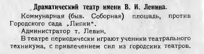 в 1926 году там вполне мог давать спектакли Советский драматический школьный театр имени вождя рабоче-крестьянской революции В.И. Ленина, организованный председателем отдела искусств Д.Н. Бассалыго... тем более, что детский театр получил это здание ещё в 1918 году: "“Совету Народ. Образ, неоднократно я докладывал, что театр Революции (находившийся с 1917 году в здании театра Очкина - прим.) с 1-го сентября будет детский бесплатный театр для школьников. Это будет 1-ый театр всей Советской России, ставящий перед собой задачу дать детям бедняков разумное и красивое развлечение и воспитание, что будет чрезвычайно содействовать развитию их и приобщению к нашим коммунистическим идеям...”