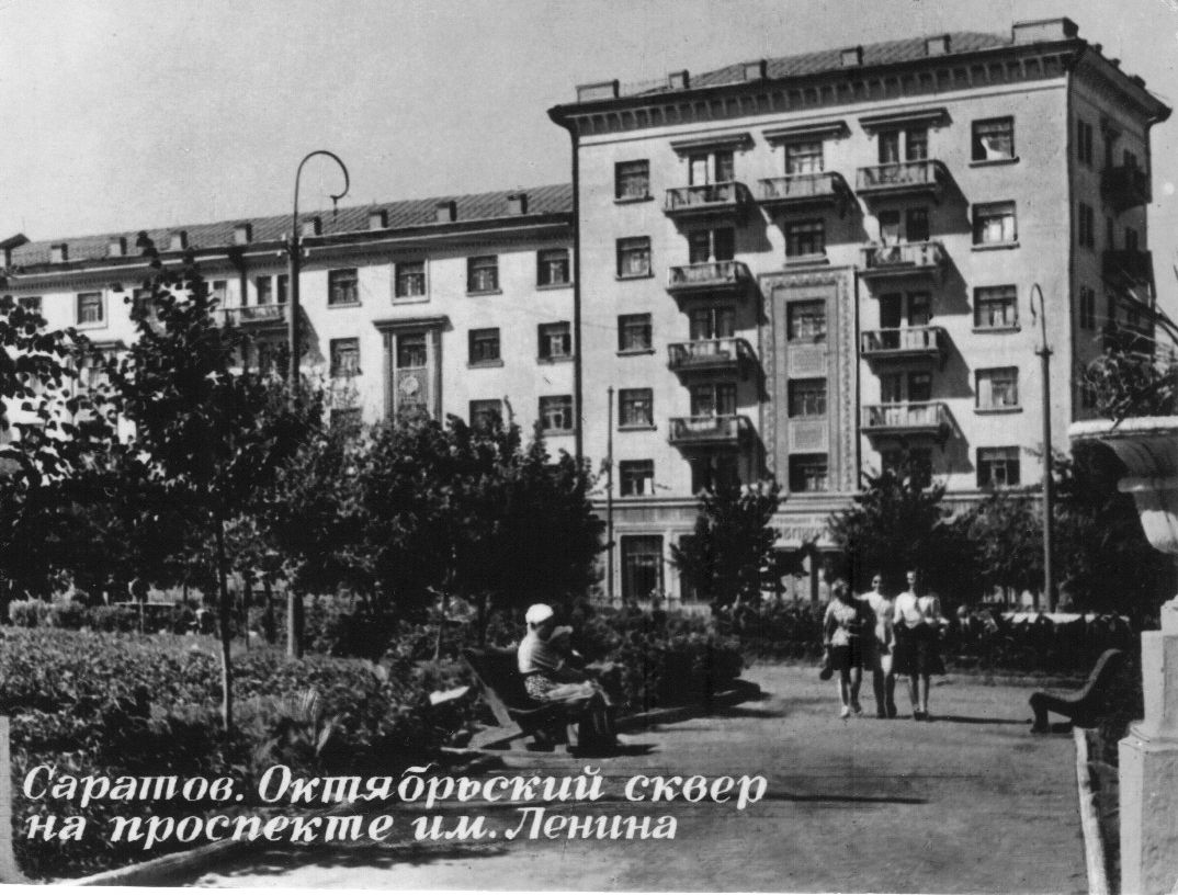 Жилой дом на улице Ленинской. 1939 г. Архитектурно оформлен в 1949 г. Архитектор Д.В. Карпов.Источник: Бондарь Н.А., Стешин И.Н. Саратов/ Под общей редакцией А.И. Осятинского. - Москва: Гос. изд-во Архитектуры и градостроительства, 1951 г.