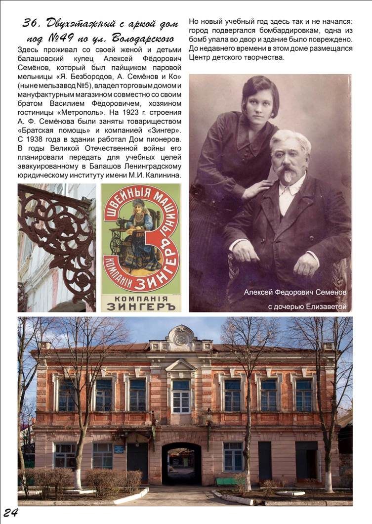 "Улица Саратовская, 51 — таков первоначальный адрес дома, где в настоящее время располагается Центр детского творчества (ныне улица Володарского, 49). Это двухэтажное здание с аркой и балконом было построено в 1853 году. В нем жил со своей семьей балашовский купец Алексей Федорович Семенов. Он был одним из совладельцев крупной паровой мельницы Торгового дома «Я. Безбородов, А. Семенов и К» (в настоящее время это мукомольный завод №5, одно из подразделений Балашовского комбината хлебопродуктов). Кроме того, купец совместно со своим братом Василием Федоровичем Семеновым, хозяином гостиницы «Метрополь», владел мануфактурным магазином.