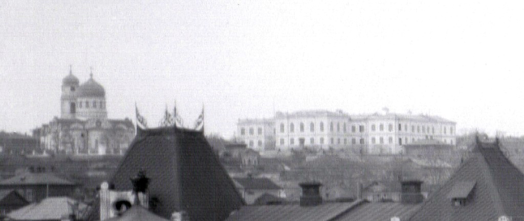 Очень редкая фотография. Вид на Покровский собор. Который располагался на месте нынешнего рынка в Вольске. Интересна фотография тем, что на фоне левой башни старого здания нынешней администрации получилась пятиконечная звезда. Которая венчала памятник советской Конституции. Памятник был открыт в 1923 году. Это можно принять за нижнюю дату. На заднем плане Покровский собор, и Мариинская гимназия. Чтобы появился такой ракурс, фото должны были делать с западной стороны крыши кафедрального собора. Который разобрали в начале 30Х годов прошлого века.