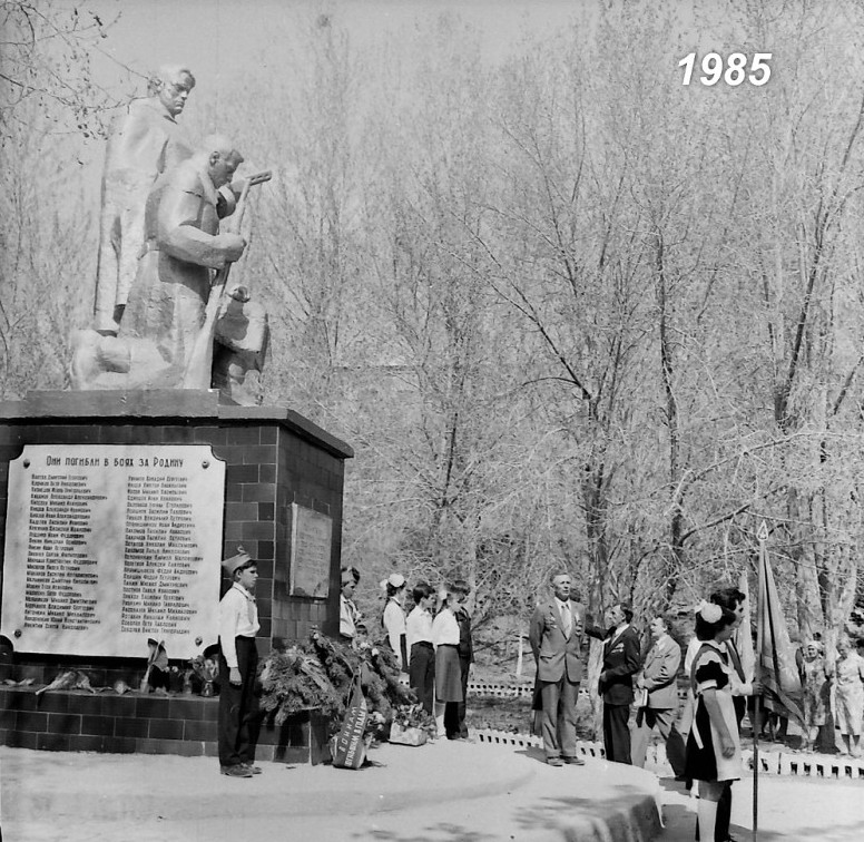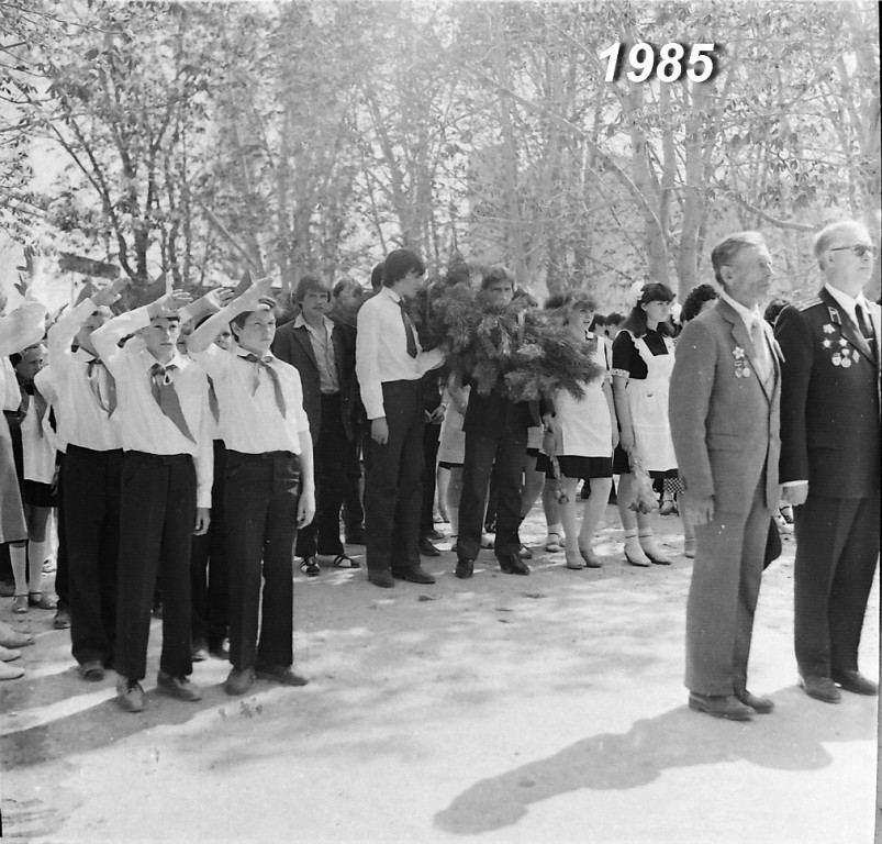 Как же давно это было! Мальчишка в центре (в профиль), между двумя девочками -это я.)) На ту пору было мне 14 лет. 8"а" класс средней школы №17. Читал там стихи какие-то.)) К сожалению, не смог больше никого идентифицировать из школьников. Немного помню ту линейку, но там такая суета была! Пожилой мужчина в темном костюме с орденскими планками -наш военрук Лифанов Николай Михайлович - ветеран Великой Отечественной. Замечательный человек- он не одно поколение научил собирать и разбирать АКМ и надевать противогаз. Я-без иронии это говорю!