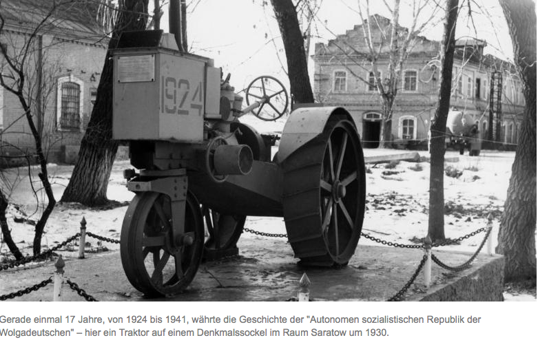 "АССР НП просуществовала лишь 17 лет, с 1924 по 1941. На снимке трактор на постаменте (цоколе) в окрестностях Саратова".