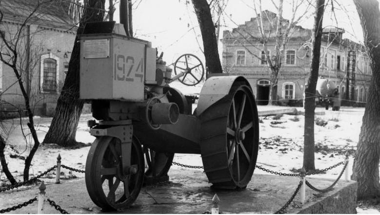 Если увеличить фрагмент фото, то видна современная автоцистерна. На которой БЕЛЫЙ квадратный номер. Сами трактора выпускались до 1930 года. Очень маловероятно, чтобы в ту пору, какой то крестьянин отдал такое сокровище в "памятник". Может быть, к столетию завода, кажется в 1980 году, когда завод наградили орденом трудового Красного знамени-а работа по "награждению" идет до года, на заводе, к 1980 году собрали модель, или муляж трактора к 100 летнему юбилею. Так что снимок сделан во времена современных автоцисцерн с "белыми" номерами.
