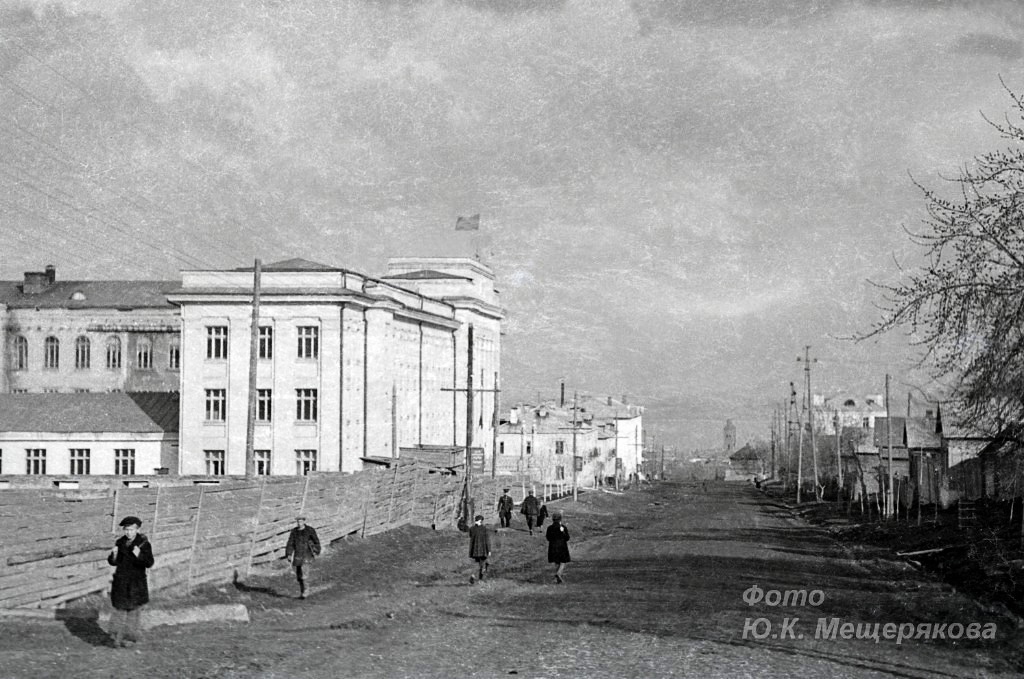 Фото из архива Мещерякова Ю.К. Ул. Саратовская. С левой стороны виден Вольский Технологический техникум. С левой стороны забор, который огораживает строительство общежития техникума. По времени, это примерно 1966-1968 год. Строительство общежития было долгостроем. И сдали общежитие в 1969 году. Еще булыжная мостовая. Вдали видна пожарная каланча на пл. Свободы с еще не разрушенной будкой на вершине.