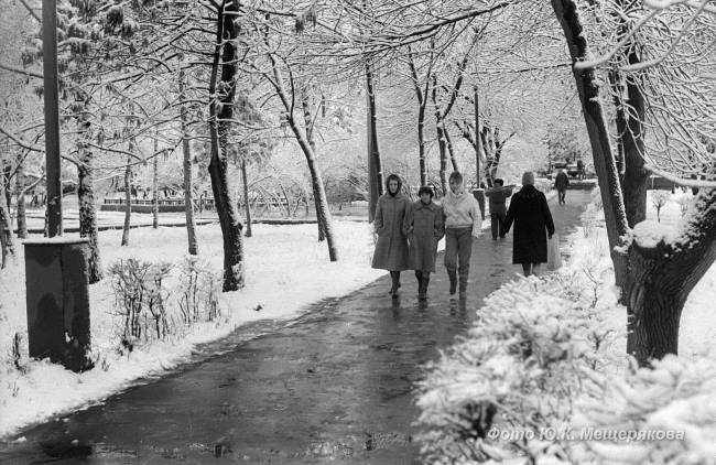 Фото из архива Мещерякова Юрия Константиновича. На снимке аллея сквера на площади перед кинотеатром "Восход". Направление аллеи от Администрации к фонтану перед кинотеатром. На заднем плане видно ограждение братской могилы продотрядовцев.