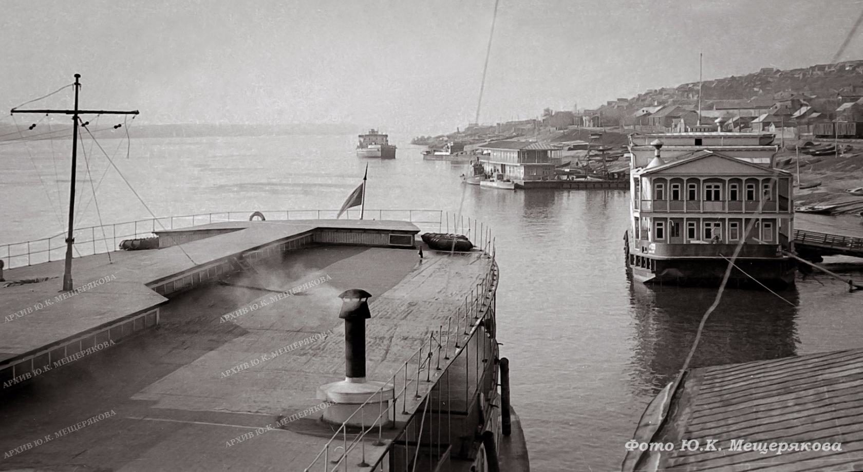 Фото Мещерякова Ю.К. Этот снимок сделан с крыши большого дебаркадера. Левее видна крыша второй палубы парохода. Направление снимка -вниз по течении реки Волга.