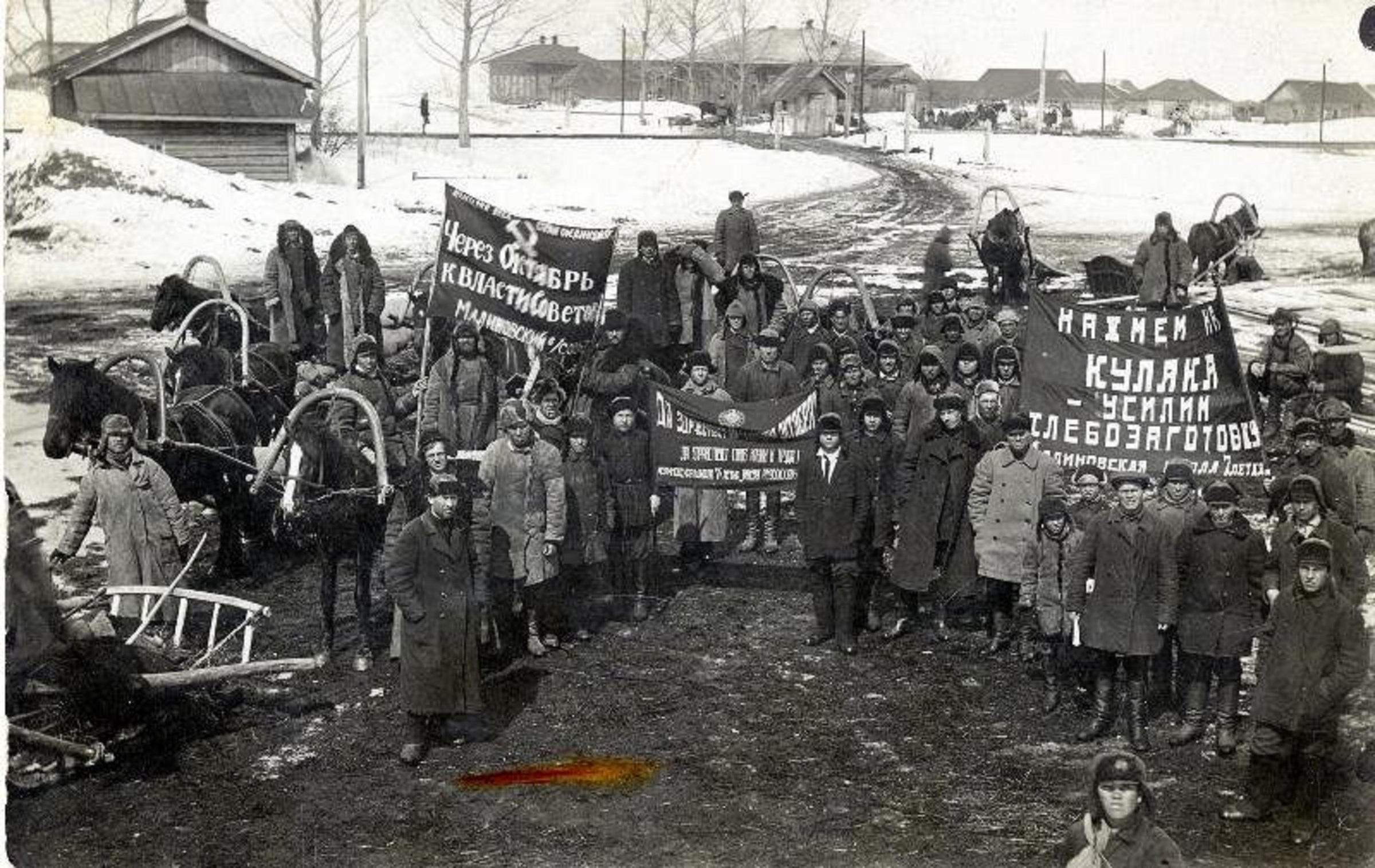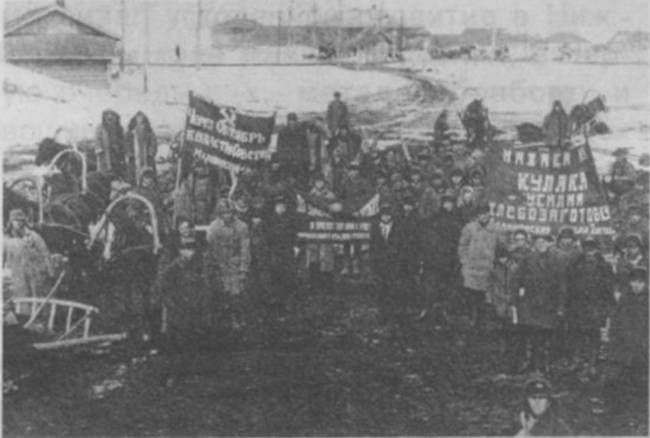 Учащиеся 6-7 классов Малиновской школы везут хлеб, отобранный у кулаков, на приемный пункт в деревне Крутец.