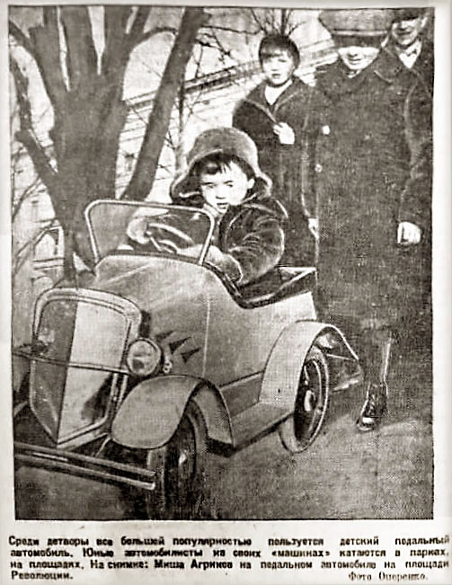 На снимках - педальный ЗИМ, вып. с 1929 г. на заводе им. Молотова в Горьком, мини-копия ГАЗ-А, сходившего с основного конвейера - точно таких же цветов: зеленый автомобиль с черными крыльями, на резиновом ходу, с фарами и хромированными бамперами. Кроме него в то время выпускали педальный ЗИС (Москва).