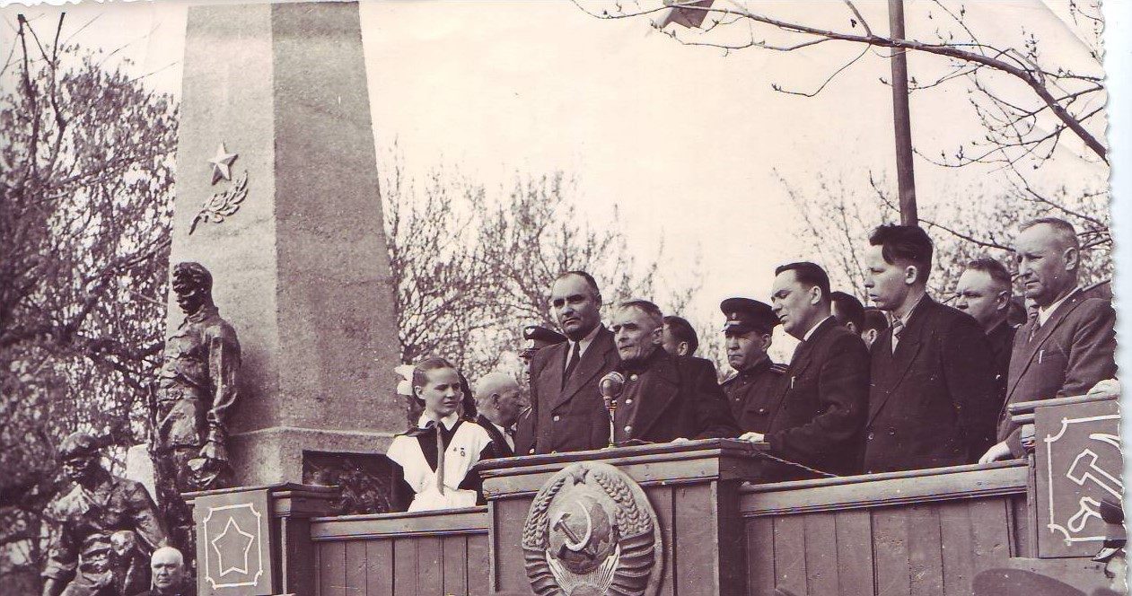 Трибуна в архаичном стиле – в глубинку новации приходили с запозданием. Новый памятник на месте кубистической скульптуры А.Тенеты установили в 1960 году.