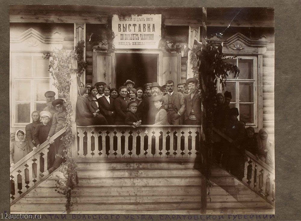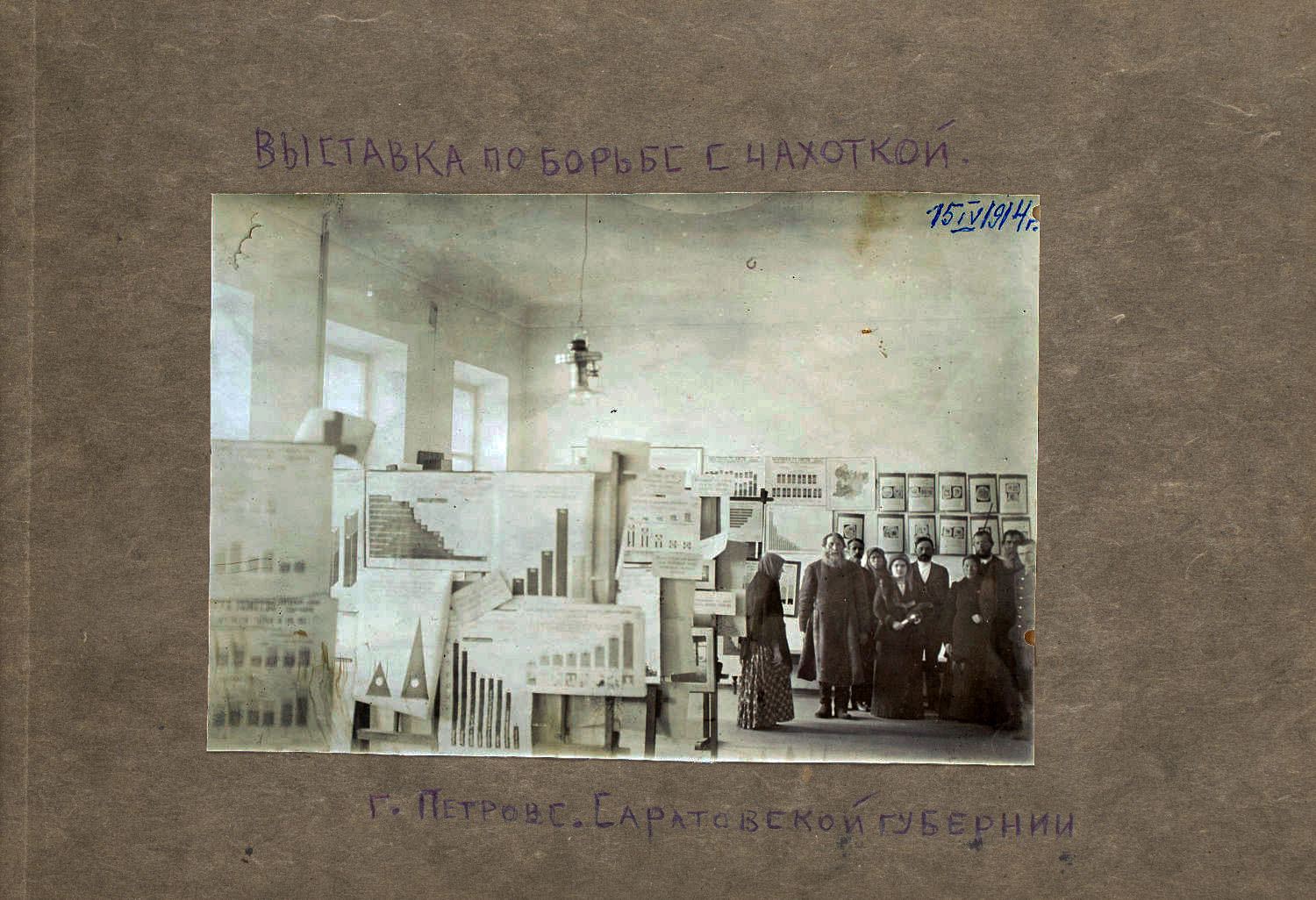 Фотоальбом "Выставка по борьбе с чахоткой. Саратовская губерния. Петровск, Вольск, 1914. - [29] фот.; - Желатино-серебряные отпечатки. Фотоальбом посвящен прошедшей в 1914 г. в Саратовской губернии выставке по борьбе с чахоткой (туберкулезом). Судя по фотографиям, выставка была передвижной и прошла в нескольких городах и селах Саратовской губернии. На снимках запечатлены также уездные медики и их транспорт – специальная упряжка. На большинстве снимках также медик Василий Николаевич Терновский.
