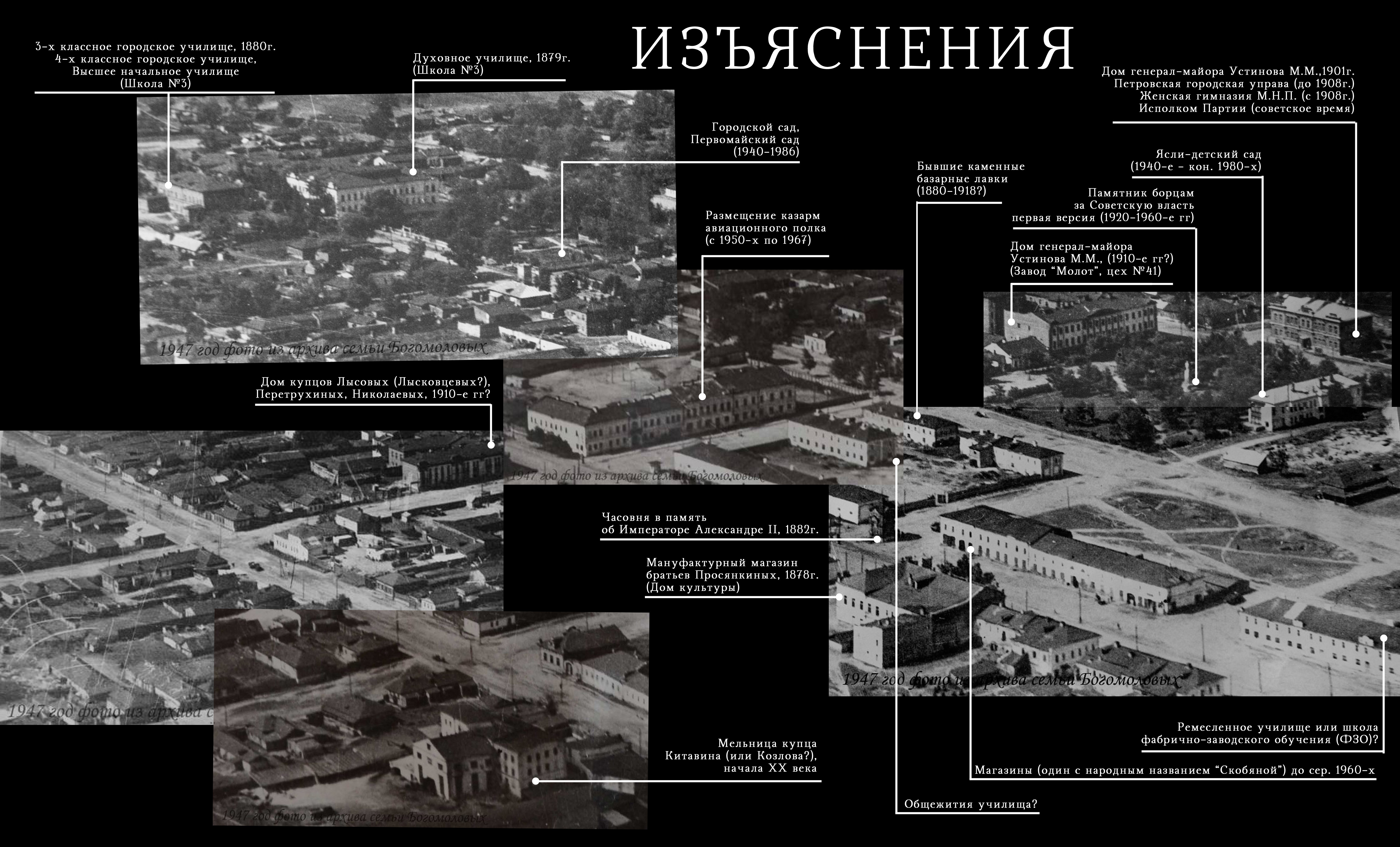 Объединил 6 разрозненных частей аэрофотосъемки центра города в 1947 году из архива семьи Богомоловых в один большой единый снимок, снятый одномоментно.