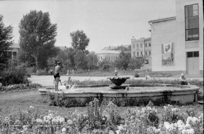 Фото из архива Мещерякова Ю. Это примерно лето 1970 года. Фонтан имеет круглую форму корпуса. Которая позднее стала многоугольной.