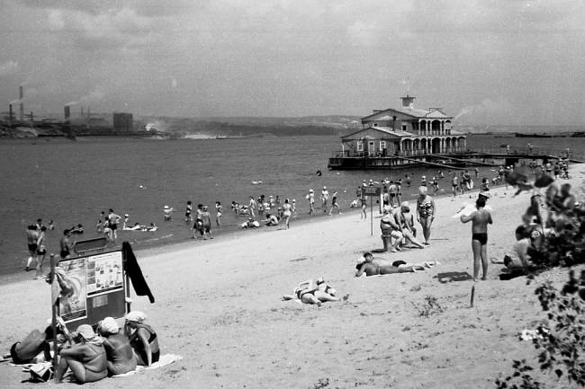 Фото из архива Уткина Анатолия. На фото - городской пляж на левом берегу Волги. Вдали дымит завод "Большевик".